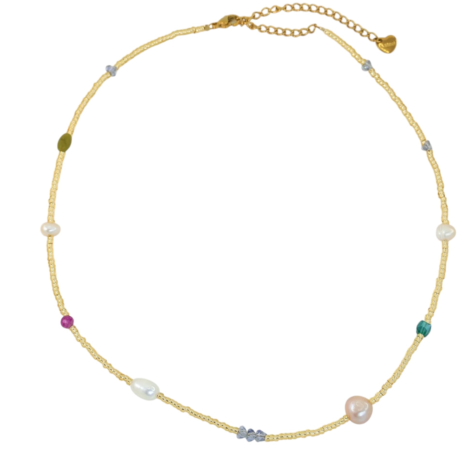 Filigrane LA FREJA Halskette aus hochwertigem Edelstahl, veredelt mit zarten Natursteinen und eleganten Süßwasserperlen. Dieses Schmuckstück besticht durch seine zeitlose Eleganz und die harmonische Kombination von natürlichen Elementen – ein perfektes Accessoire für jeden Anlass. Dieses Produkt gehört zum limitierten Modeschmuck-Sortiment, bietet ein 14-tägiges Rückgaberecht und unterliegt speziellen Garantiebedingungen.